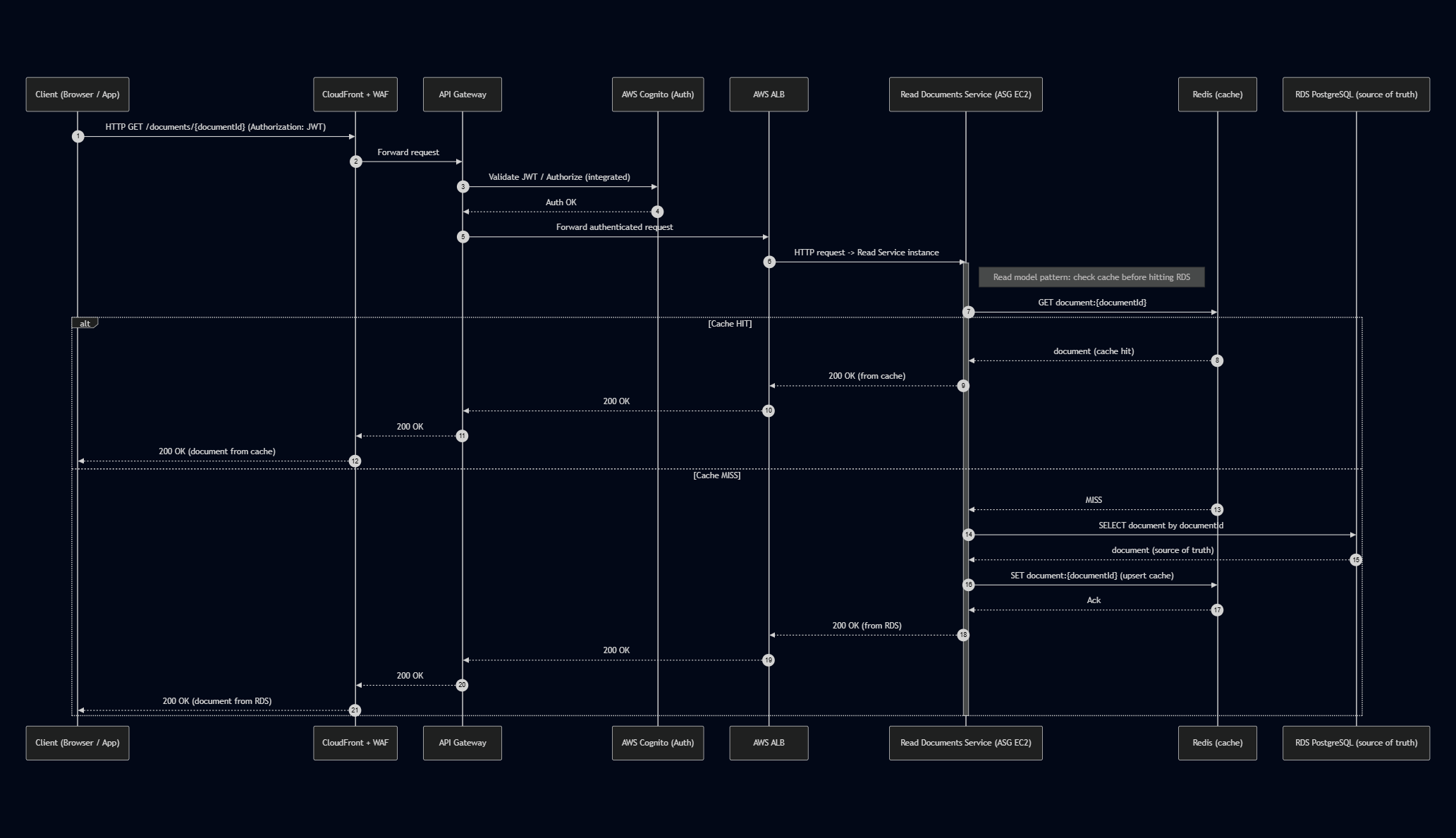 Note right of ReadSvc: Read model pattern: check cache before hitting RDS