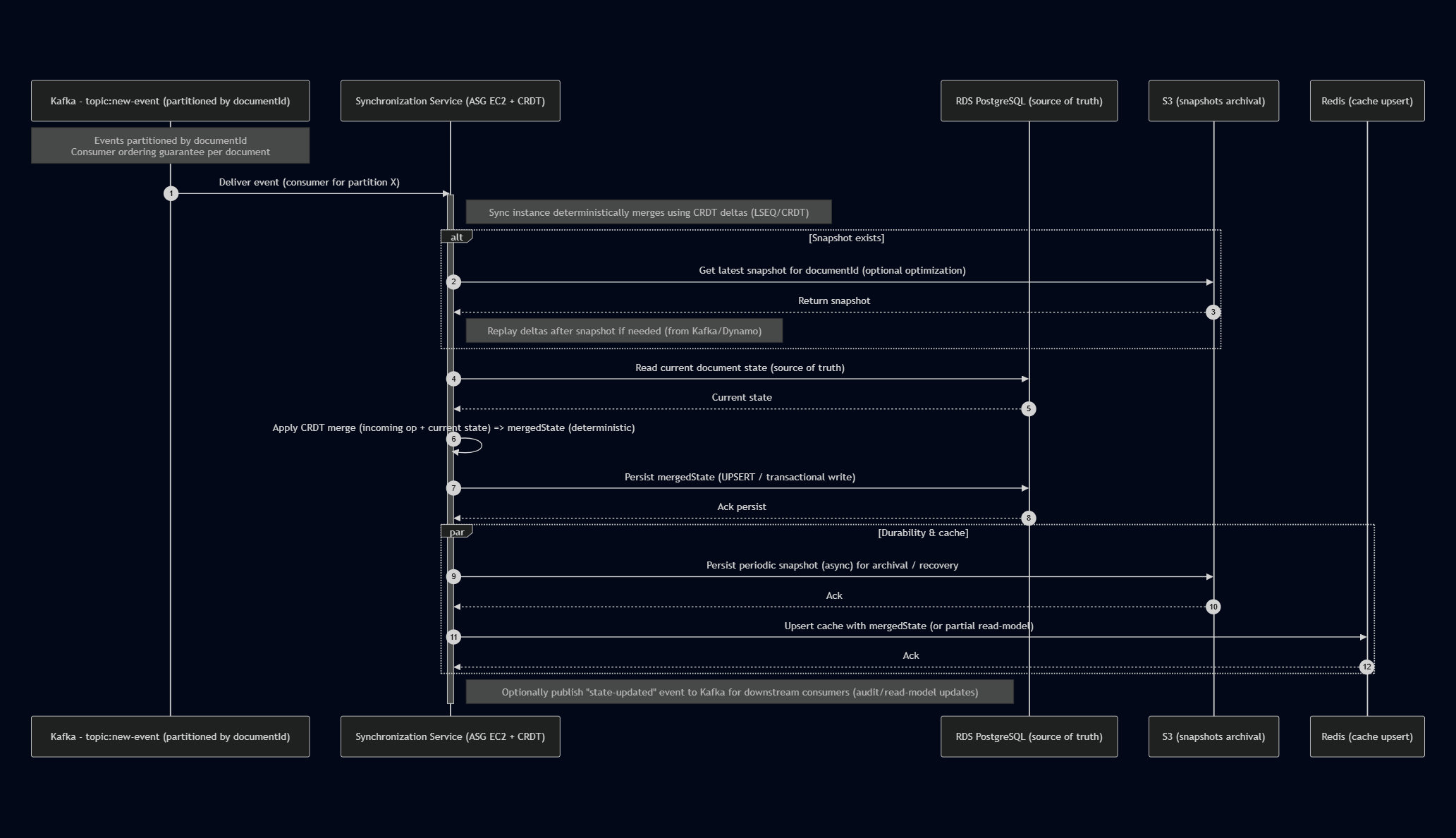 Sync->>S3: Get latest snapshot for documentId (optional optimization)