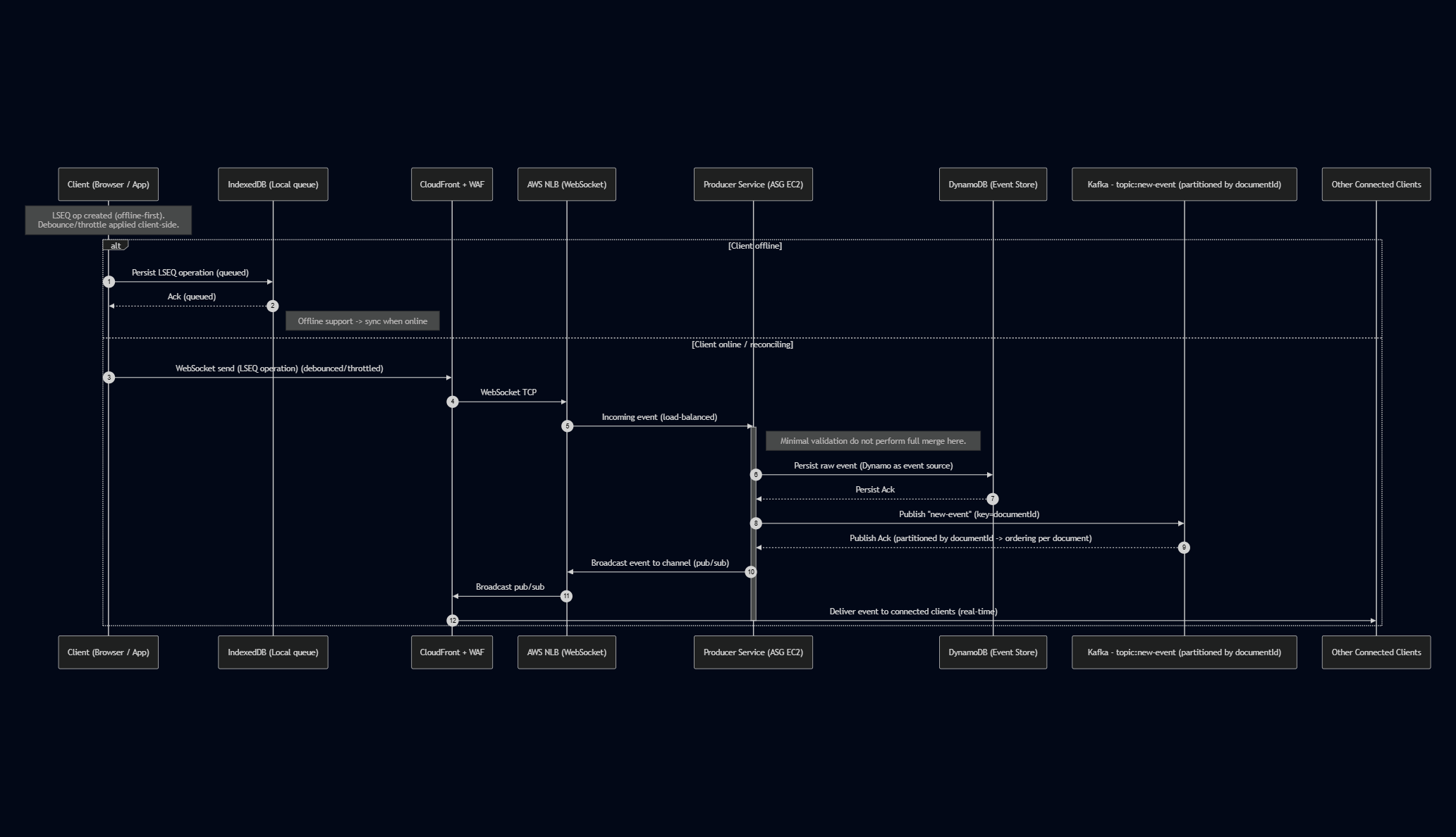 Client->>CF: WebSocket send (LSEQ operation) (debounced/throttled)